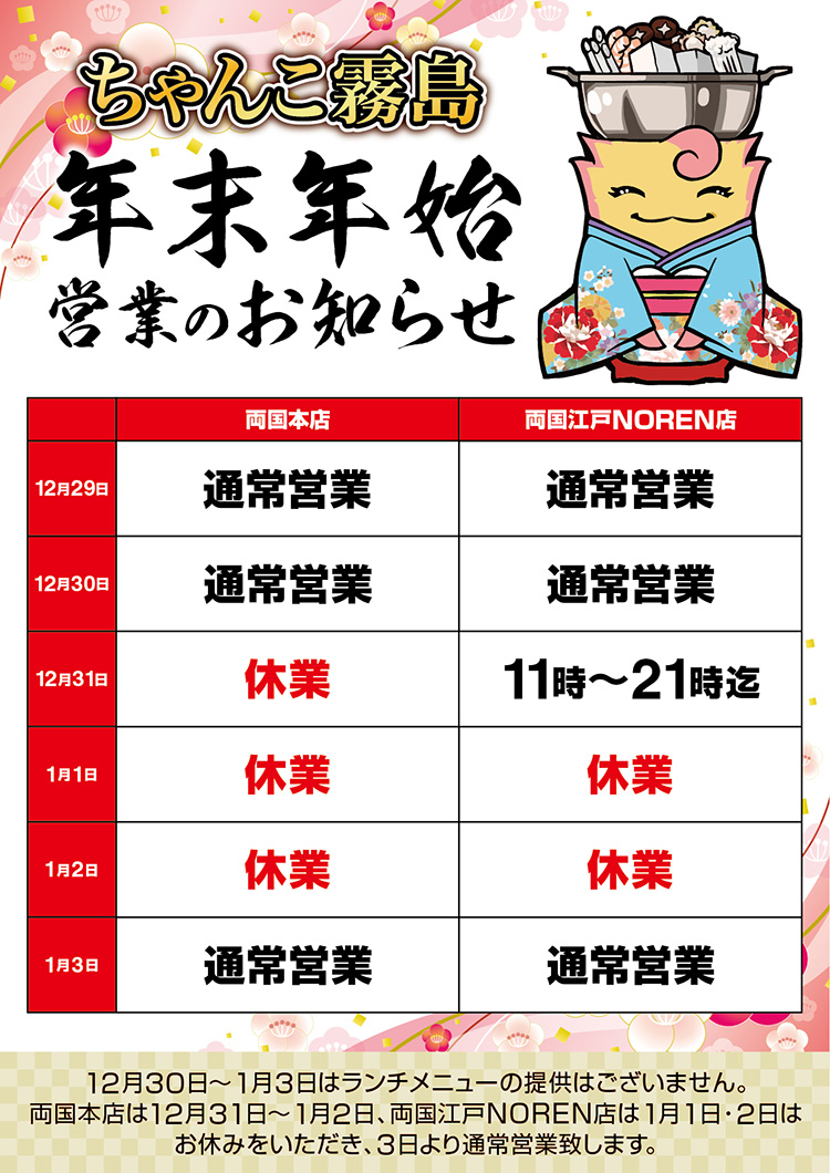 年末年始の営業日は下記になります。