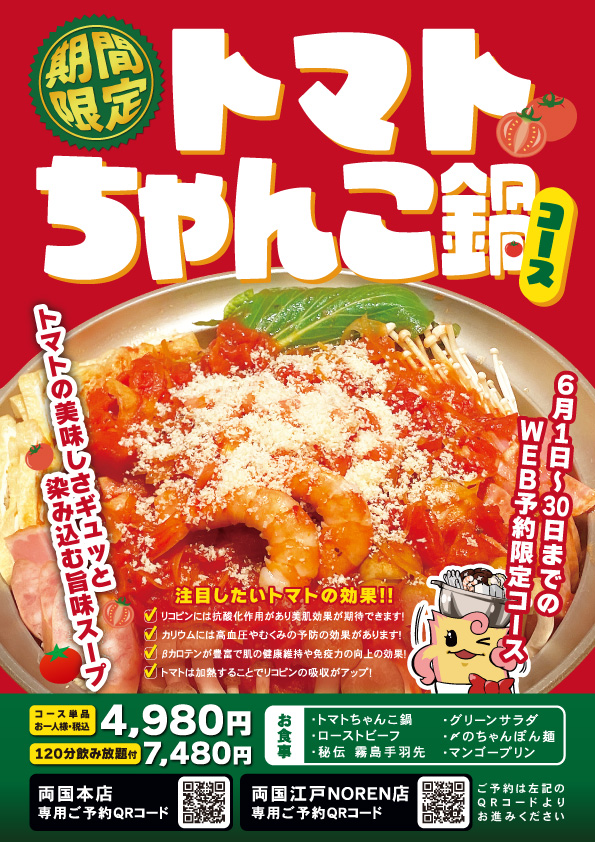 トマトの旨味にチーズが合わさる洋風ちゃんこが今年も登場!! 旨味と酸味が一体となったスープにチーズを加えてコクUP☆ 今年は【鍋単品】も登場しました。ご予約はぐるなび/食べログ/ホットペッパーよりご注文下さい。 ※掲載価格はWEB予約価格となります。当日店舗にてご注文の際は価格が異なります。